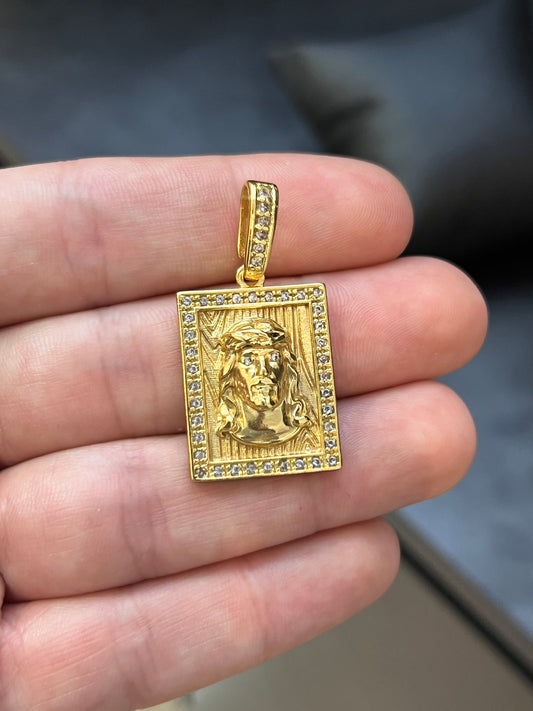 Pingente Placa Face Jesus Cravejada M (2x2,5cm) Banhado a Ouro 18K