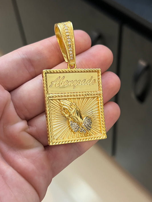 Pingente Placa Mão Fé Abençoado GG (3,6x4,7cm) Banhado a Ouro 18K