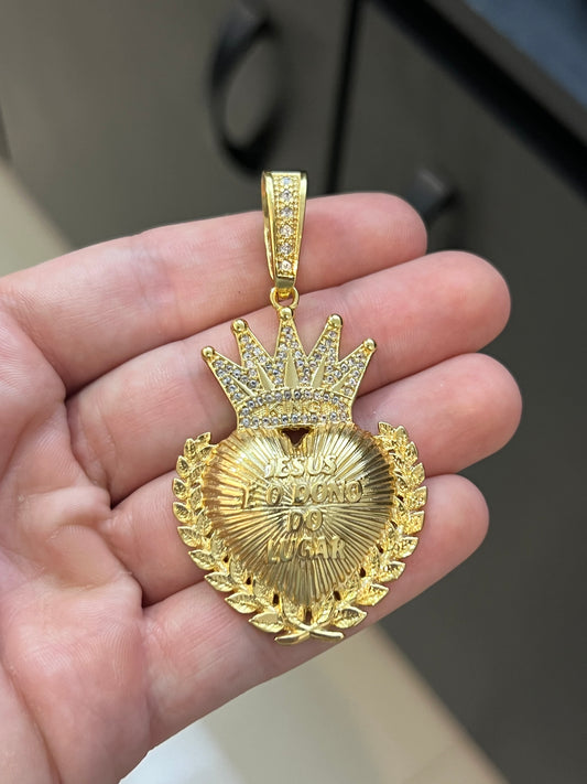 Pingente Coração Jesus Dono do Lugar Cravejado G (3,7x5,5cm) Banhado a Ouro 18K