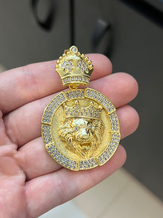 Pingente Medalha Leão e Coroa Cravejado G (4x4,5cm) Banhado a Ouro 18K