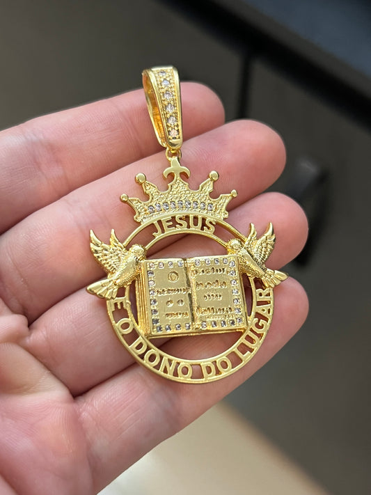 Pingente Medalha Jesus dono do lugar Bíblia G (4X5CM) Banhado a Ouro 18K
