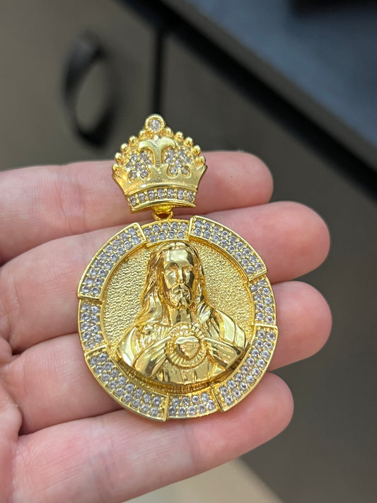 Pingente Medalha Jesus Cristo e Coroa Cravejado G (4X4,5CM) Banhado a Ouro 18K