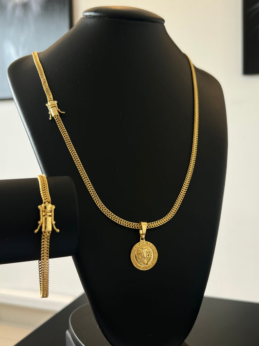 Kit Corrente Union 5mm - 70cm + Pingente Medalha Leão Judá P + Pulseira de Brinde (Banhado a Ouro 18K)