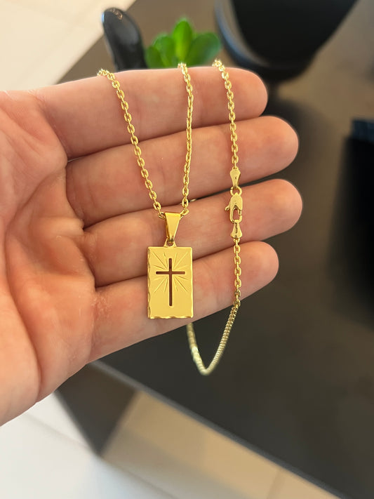 Kit Corrente Cadeado 2mm - 70cm + Pingente Placa e Cruz vazada P (Banhado a Ouro 18K)