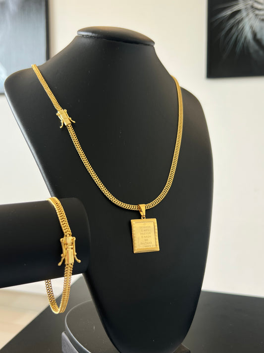 Kit Corrente Union 5mm - 70cm + Pingente Placa o senhor é meu pastor M + Pulseira de Brinde (Banhado a Ouro 18K)
